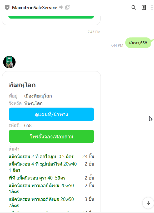- ใช้การแชร์พิกัดเข้าไลน์ เพื่อให้ดูสต๊อคสินค้าที่มีอยู่ของสาขาใกล้เคียง ในระยะที่กำหนด พร้อมแสดงพิกัดนำทาง เบอร์โทรสาขาด้วย เผื่ออยากสอบถามข้อมูลอื่นๆ